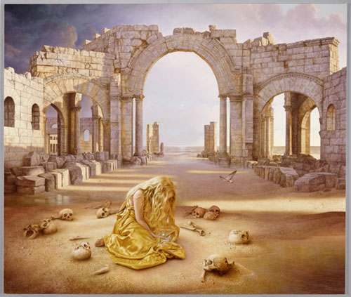 In de volgende fase wordt gezocht naar een beeld om de eerste inspiratie met vorm te bekleden. om terug te komen op mijn schilderij 'The discovery' begon de originele emotionele lading zich in mijn geest te verbinden met een beeld dat ik had van mijn dochter Rowanne. Door deze verbinding werd een krachtige, bijna archetypische betekenis verleend aan de meisjesfiguur die door de plaatsing van de figuur in een omgeving van verval nog aanzienlijk werd versterkt! Om dit alles vast te leggen werkt een snelle houtskooltekening in grijstonen en zwart-wit contrasten voor mij het beste. Belangrijk is het om de verleiding te weerstaan deze eerste inspiratie in een rustig uitgewerkte tekening te vangen omdat dan veel van de authentieke emoties en beeldende inzichten verloren kunnen gaan. De emoties moeten op dynamische wijze, tijdens een intens proces, geregistreerd en gevangen worden. Het moet een ruwe snelle schets worden die de kracht van het oorspronkelijke beeld als het ware bevriest en vastlegt. In deze fase ben ik meestal zeer emotioneel geladen en schommel ik tussen stemmingen van onrust en angst om de essentie van de originele gevoelsblauwdruk te missen en een zekere exaltatie wanneer de oorspronkelijke inspiratie zichtbaar wordt in het zich vormende beeld. Is de schets goed dan is een solide basis gelegd voor een bezield kunstwerk! De volgende fase van de onderschildering bestaat doorgaans meer uit transpiratie dan uit inspiratie. Dit is de fase waarin de vorm, die al min of meer in de eerste schets geïnspireerd was vastgelegd, met veel geduld en doorzettingsvermogen moet worden vertaald in verf. Vergeleken met de eerste fase van incubatie en de tweede fase van tekenen is dit een meer rationele en taaiere klus! Maar zodra de eerste transparante kleurlagen worden gelegd doet de magie van de kleur alle leed vergeten en is vanaf dat moment het fascinerende proces begonnen om door middel van kleur, sfeer en toonwaarde de oorspronkelijke inspiratie te verbeelden en naar zijn hoogst mogelijke intensiteit te leiden! Het is nu dat de scheppende ziel keer op keer verrast wordt door vondsten en effecten die niet lijken voort te komen uit eigen initiatief en werkzaamheid, maar eerder een mysterieuze en transcendente oorsprong suggereren. Het hart kan dan zo geraakt worden door verwondering en schoonheidsbeleving dat tranen kunnen vloeien! Dit zijn als het ware geschenken die onderweg worden aangereikt; het betekent geenszins dat van transpiratie tot aan de voltooiing geen sprake zou zijn. Integendeel.